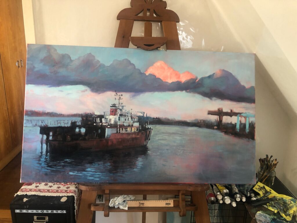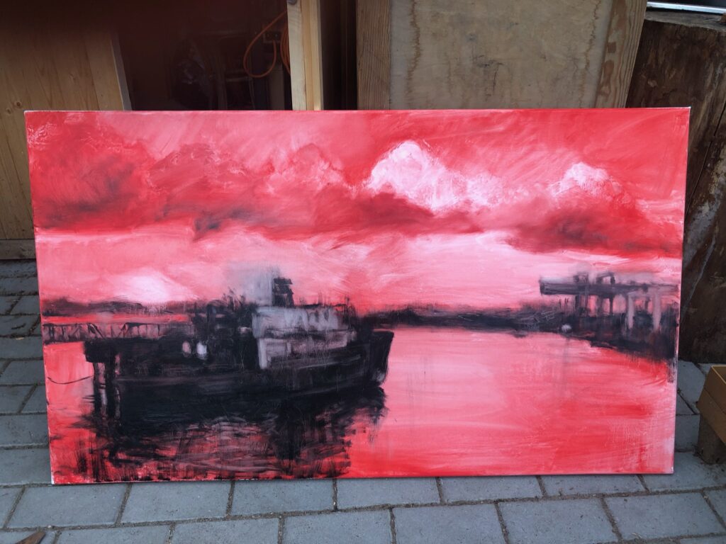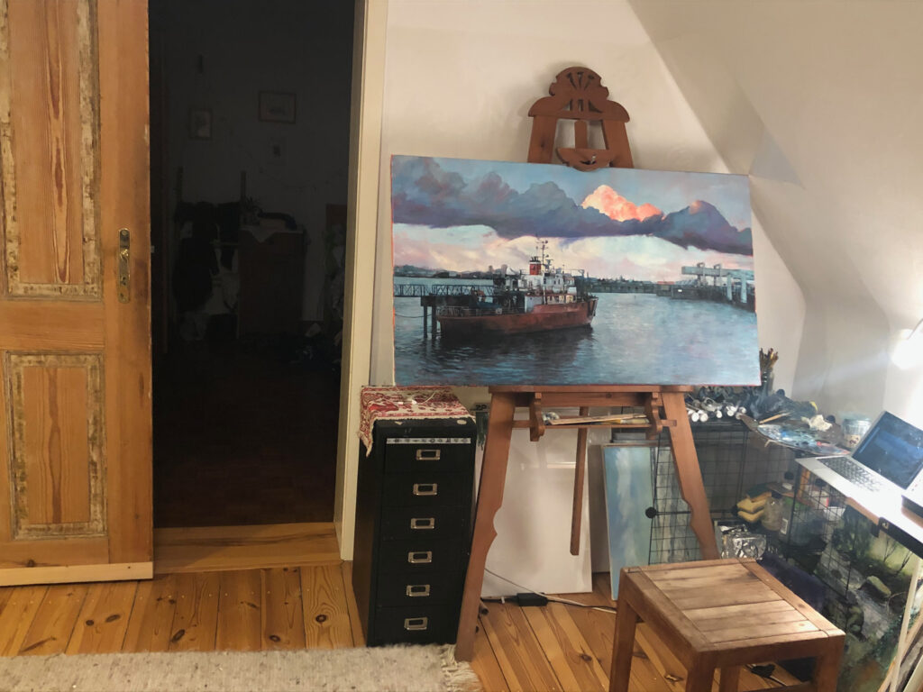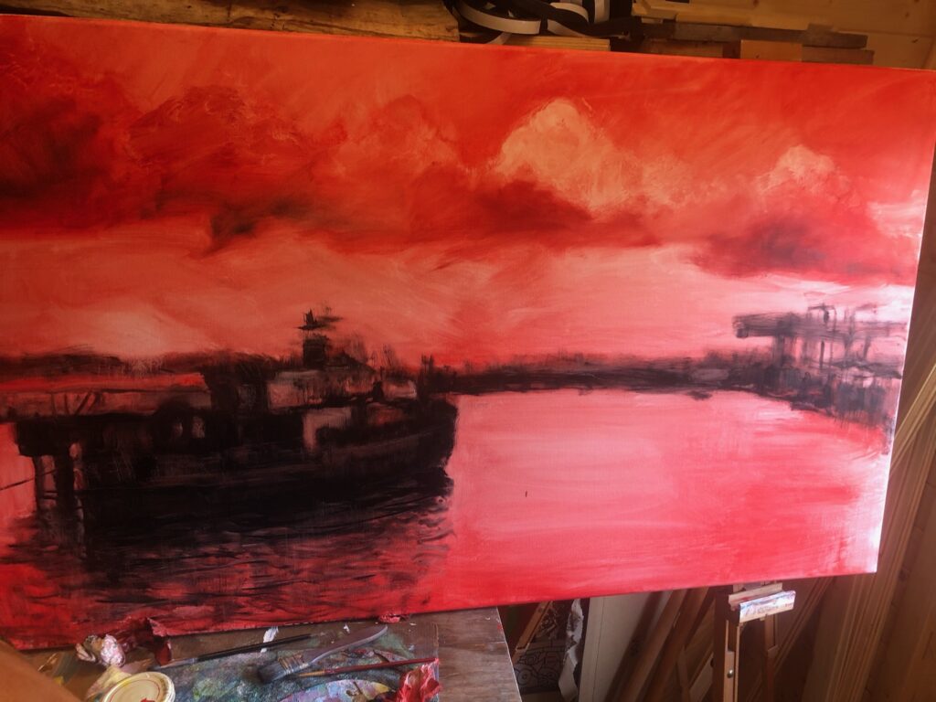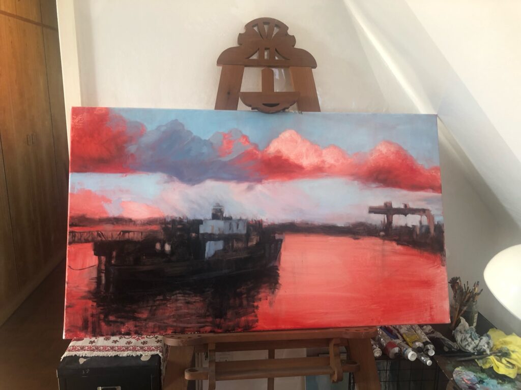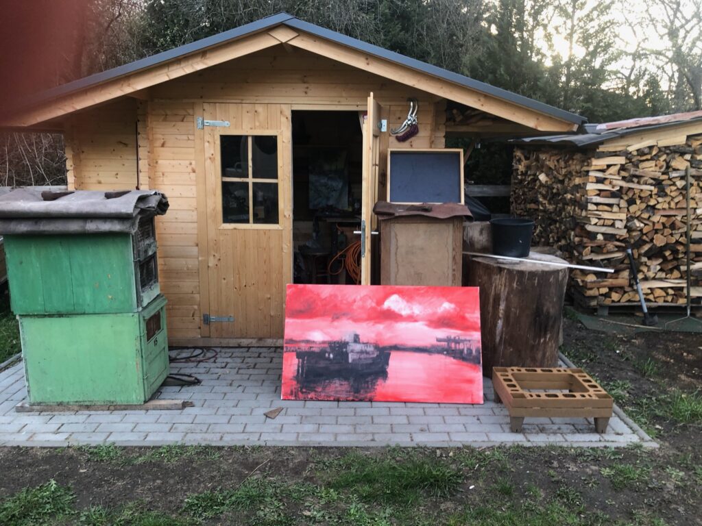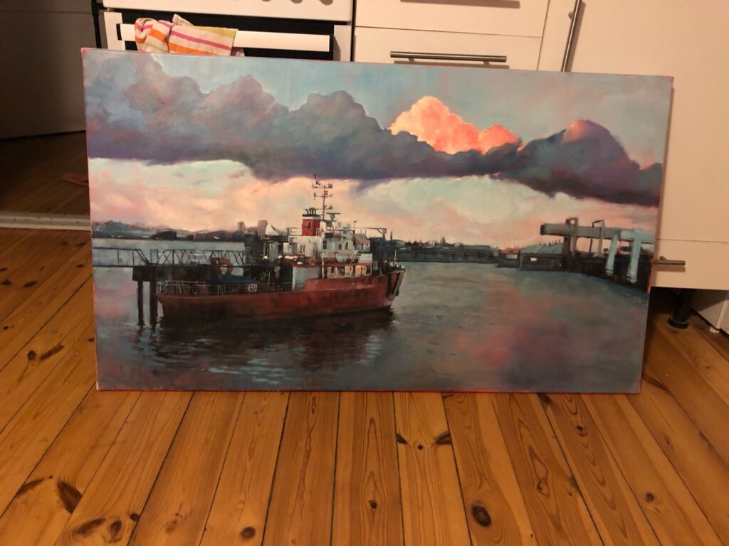 Here you can see the way work depicting the view on Cardiff Bay progressed. It took over three months to finish, mostly also because we moved in the meantime into our own flat. As you see, I started painting already here in Germany, in the amazing and very much beloved garden shed belonging to my partner’s family. The picture did not really fit in there though, and I had trouble not messing everywhere with a red paint.