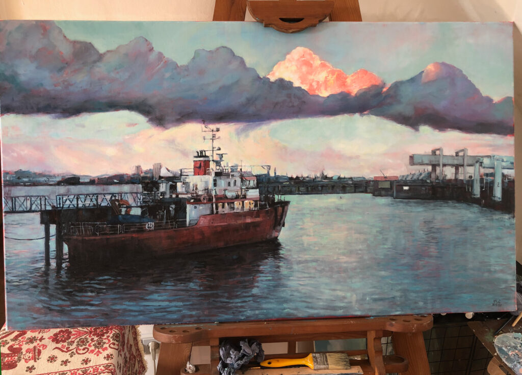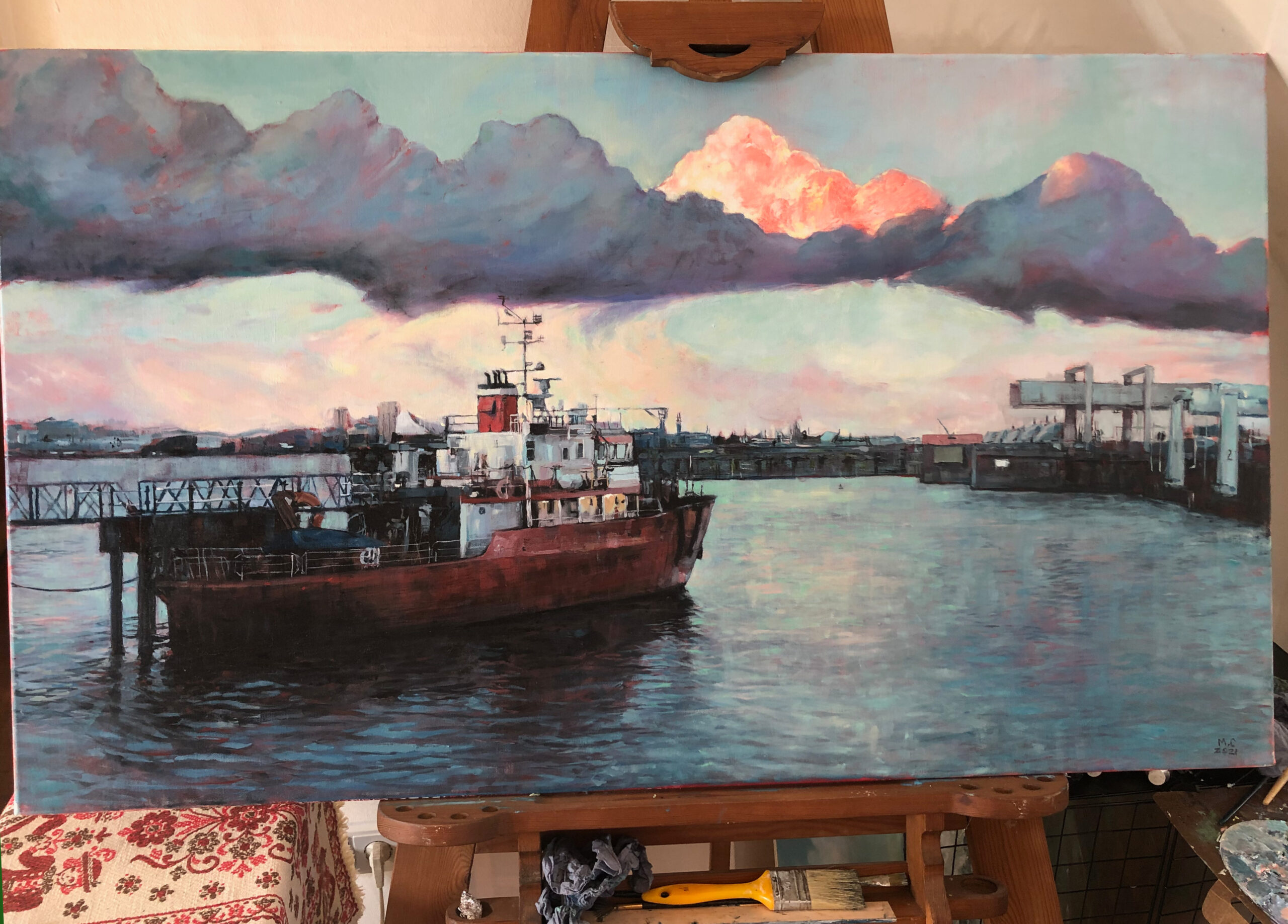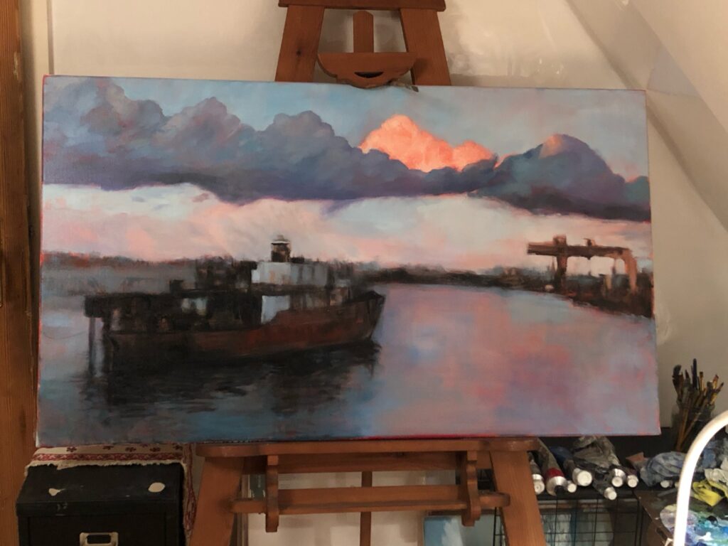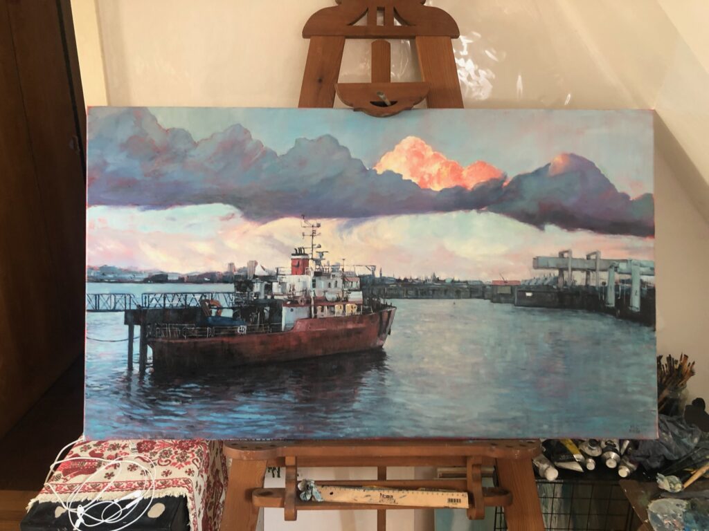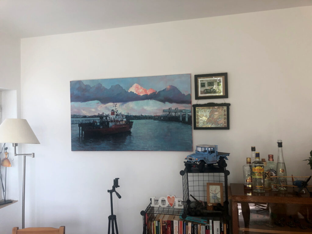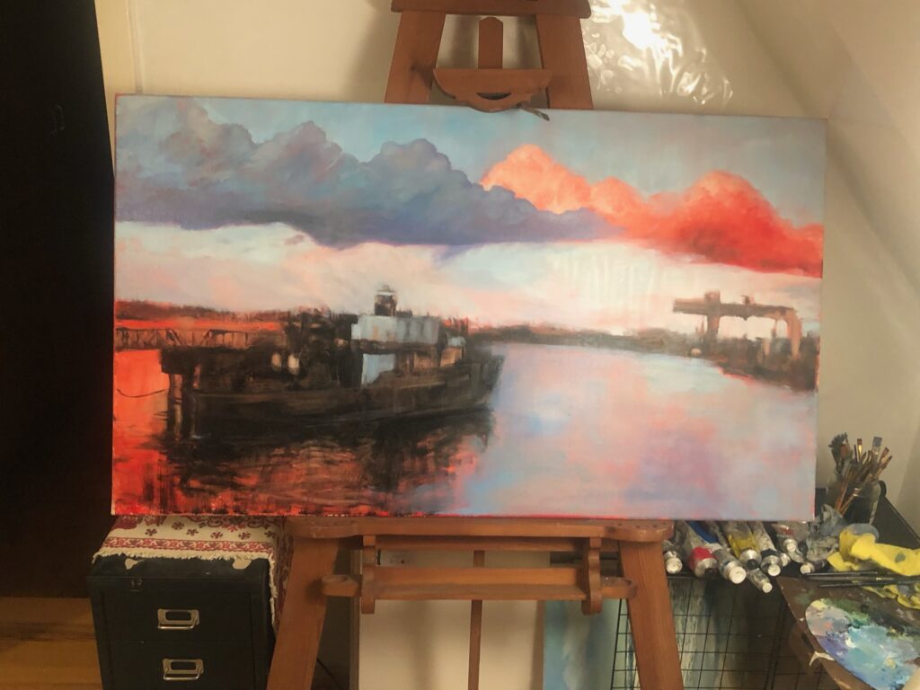 Here you can see the way work depicting the view on Cardiff Bay progressed. It took over three months to finish, mostly also because we moved in the meantime into our own flat. As you see, I started painting already here in Germany, in the amazing and very much beloved garden shed belonging to my partner’s family. The picture did not really fit in there though, and I had trouble not messing everywhere with a red paint.