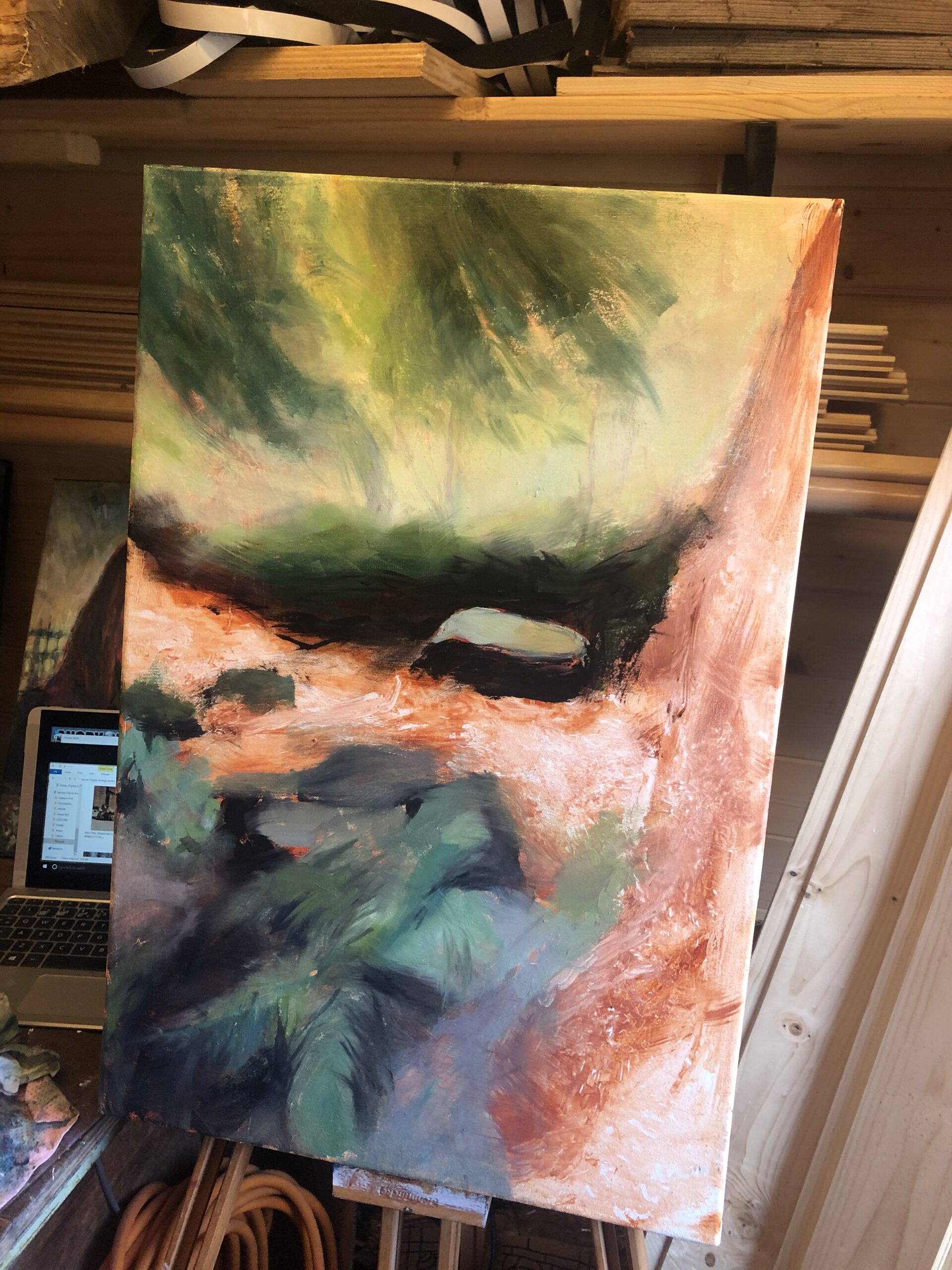 While working on this one I used fast drying underpainting. It was an experiment, since usually I prefer to go for a red colour for an underpainting in most cases, but instead I chose Burnt Sienna in this case. I wanted to finally try out why is it considered as a most common way to start with a picture. As you see, I did not worry much about perfection, I was using loose working style and enjoy the effects of energetic brushstrokes together with slightly transparent layers of colours.