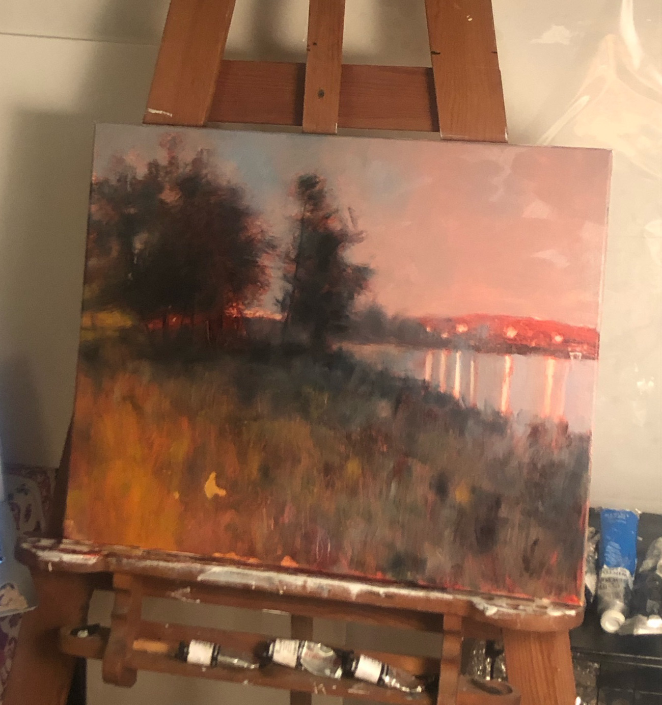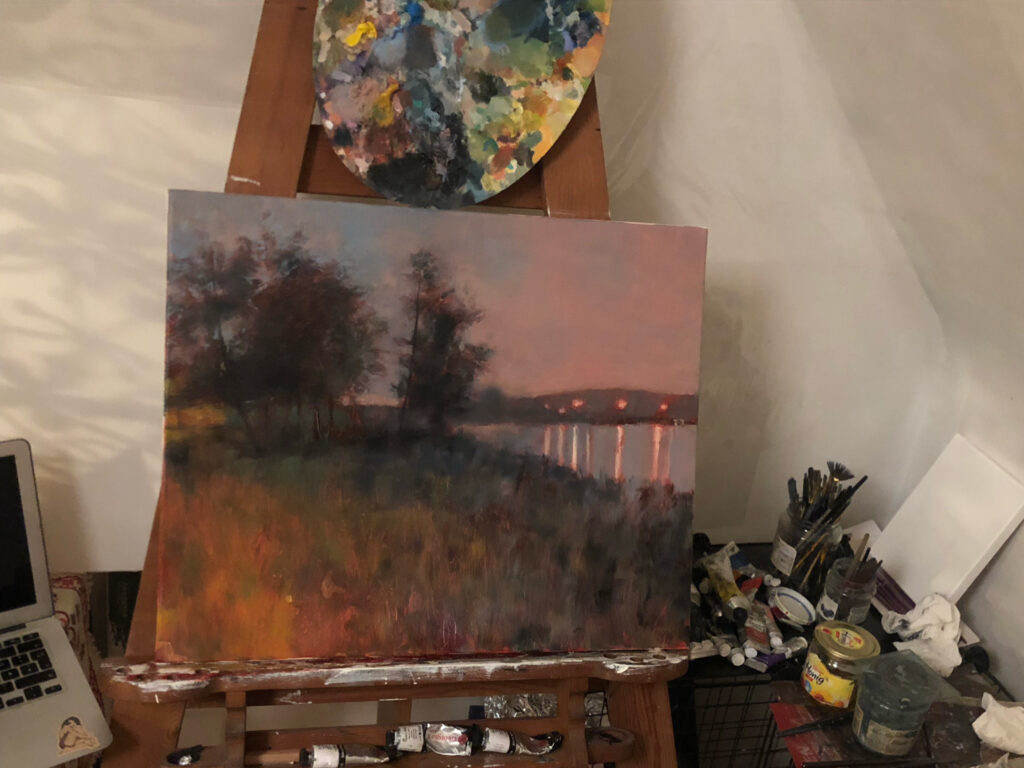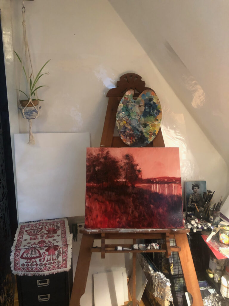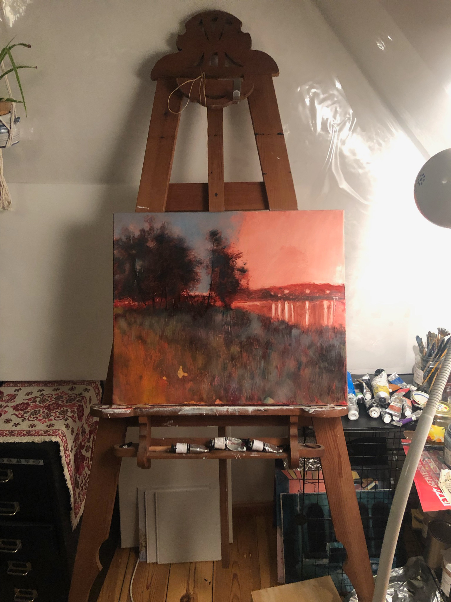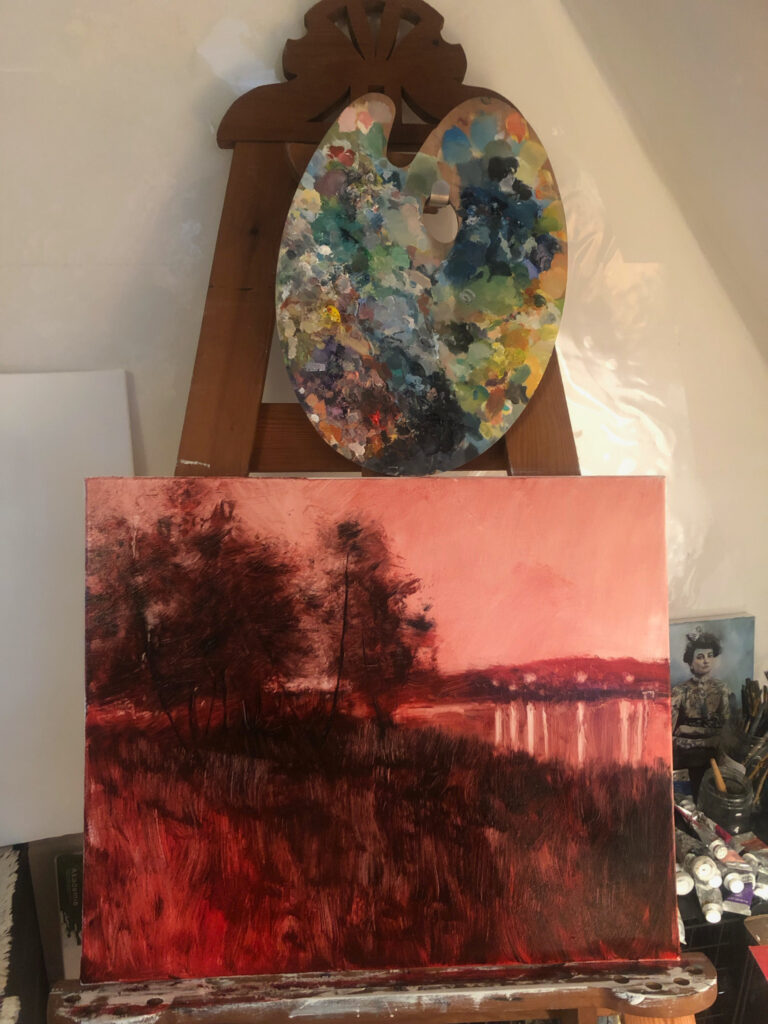 I started with my favorite form of underpainting – the red one. The key is to let it properly dry, so I left two weeks for the picture to rest before continuing with next layers. The rest was fairly simple – once the initial layer is dry, glazing over makes a unique colour tones while preserving the pattern from the underpainting. I made my way through the sky and trees until I had only lights left. I purposefully left some small parts of underpainting untouched – for effect.