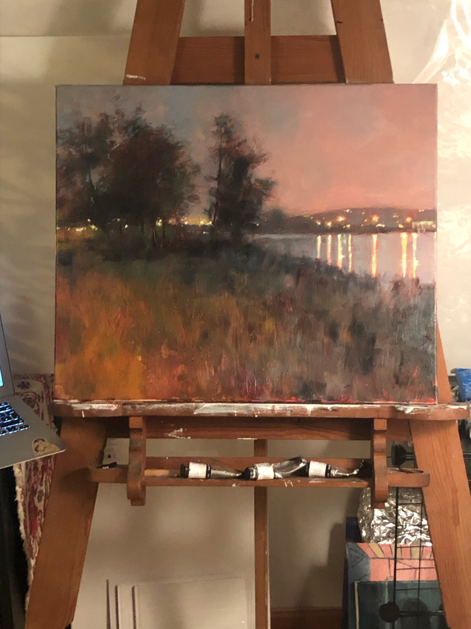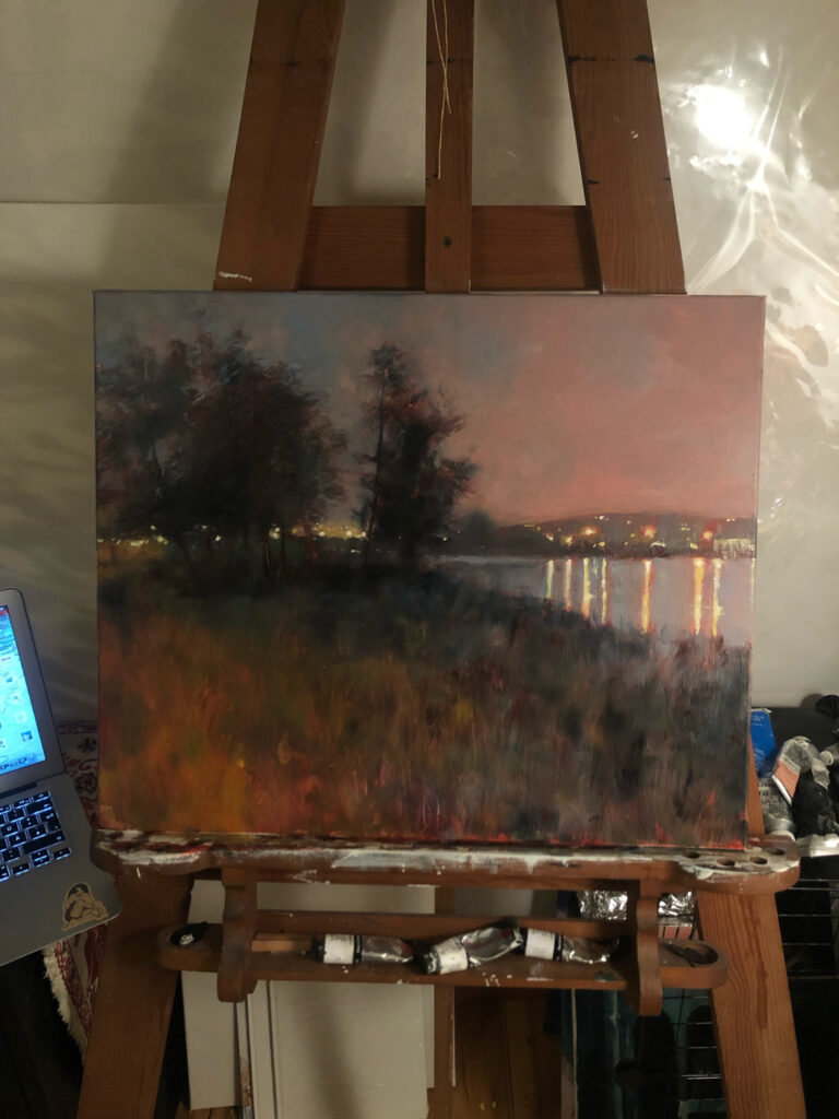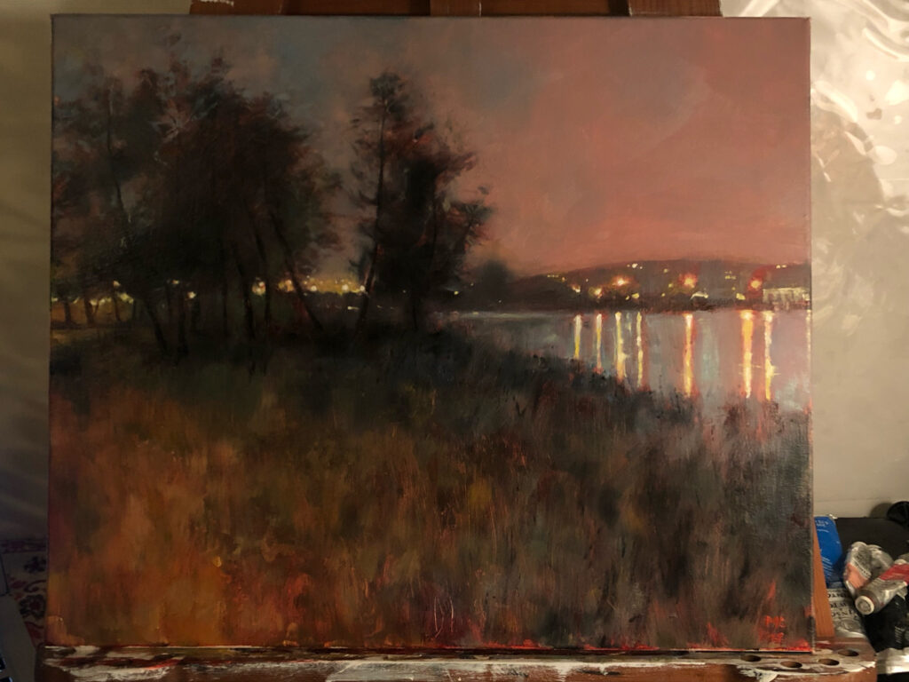 The lights of the lake were only places of the picture where I used a thicker paint instead of the thin layers. This is also why they stand out of picture in little bit of a 3D effect.